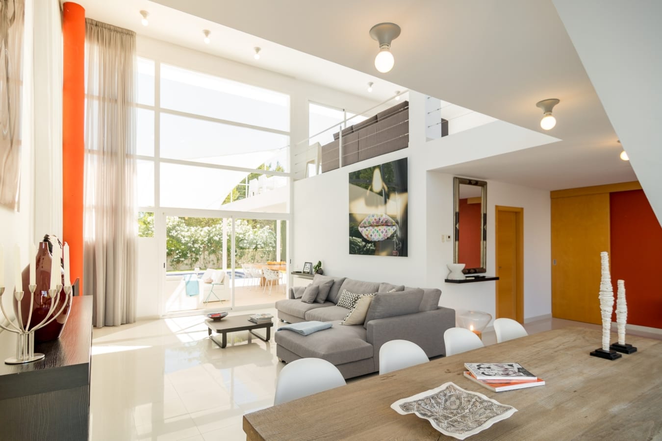 Inside, Casa Ciro is adorned with modern elegance and vibrant touches of color. The main living room, adjacent to the dining area, overlooks the pool and serves as a stylish hub for gatherings. The dining room features a table that seats ten guests, ideal for family dinners or entertaining. The kitchen is fully equipped with state-of-the-art appliances, ensuring all your culinary needs are met.